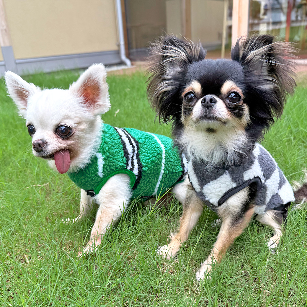 チワワ2.7kg(首19/胴30/丈27cm)のこむぎくん【左】はボーダーグリーンのS、1.7kg(首18/胴23/丈27cm)のざらめちゃん【右】はチェックDのXSを着用