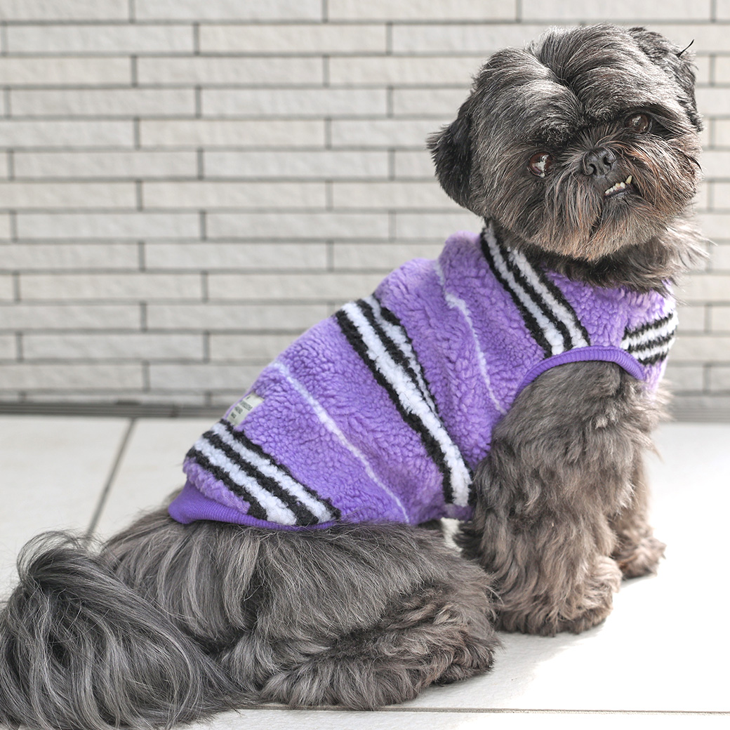 シーズー5.4kg(首26/胴38/丈38cm)のつぶくんはボーダーパープルのLを着用