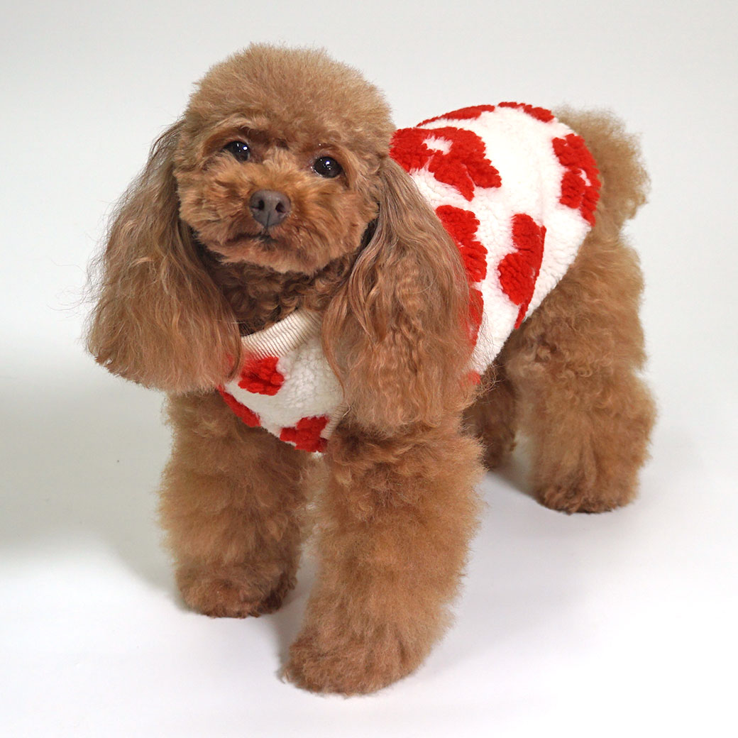 プードル2.5kg(首19/胴31/丈26cm)のグミちゃんはフラワーホワイト×レッドのMを着用
