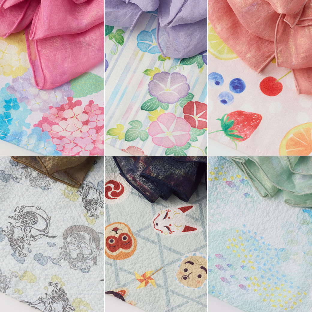 - 紫陽花/アサガオ/フルーツ:ポリエステル100% 風神雷神/お面籠目/マリンブルー:ポリエステル95%、ポリウレタン5% 帯:ポリエステル100%