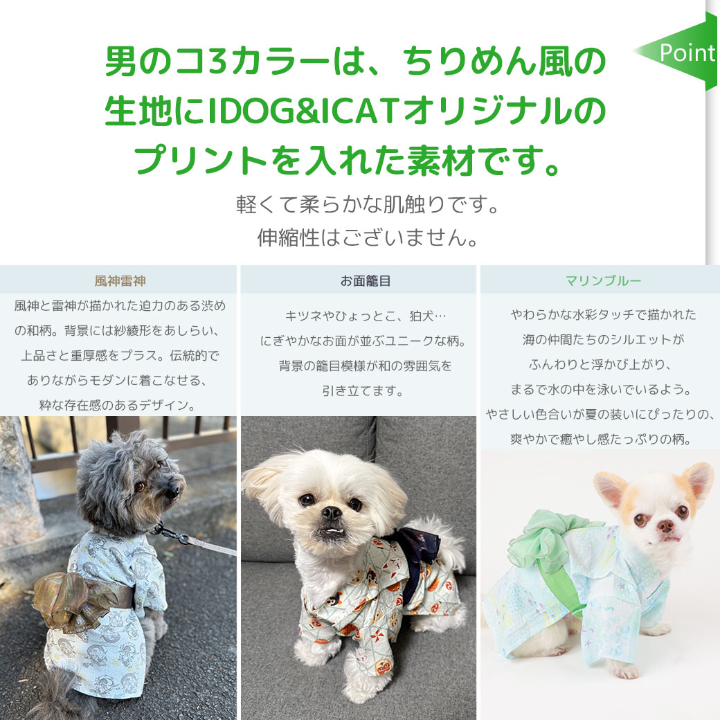 男のコ3カラーは、ちりめん風の生地にIDOG&ICATオリジナルのプリントを入れた素材です。
