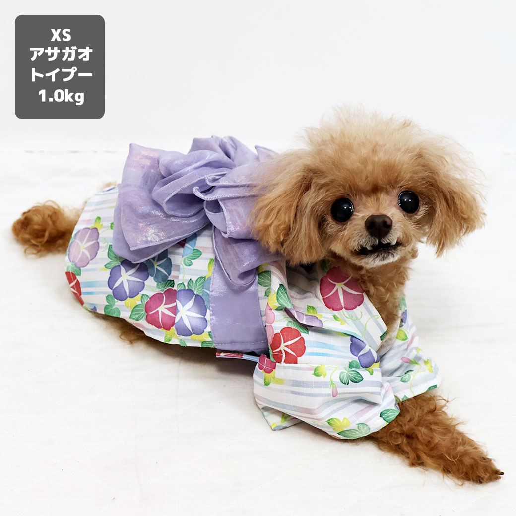 トイプー1.0kg(首14/胴25/丈17cm)のミーナちゃんはアサガオのXSを着用