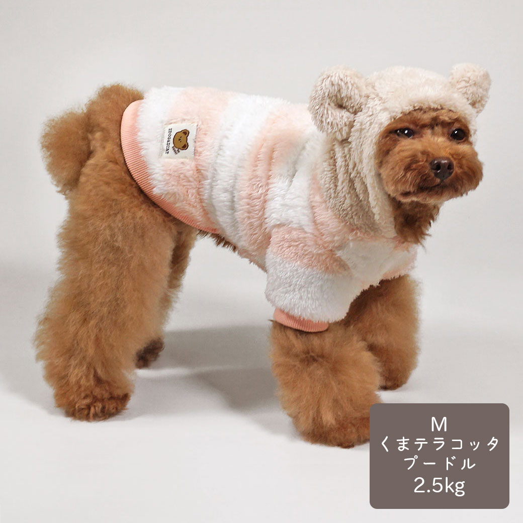 優しい色合いと、ふんわりやわらかなもこもこ素材が可愛い犬用パーカーです。