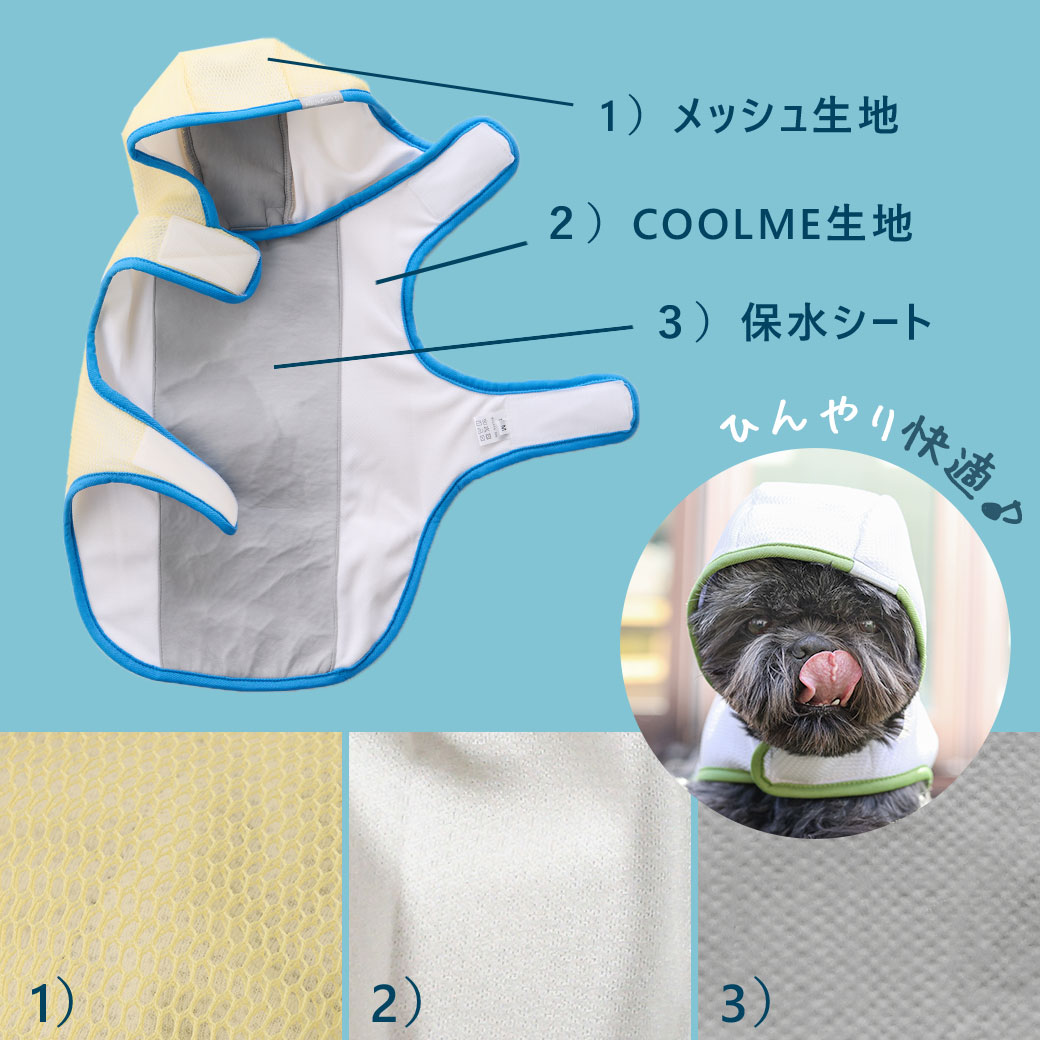 COOLMEのひんやり素材だけでも冷えるのですが、太陽光が当たるとすぐに蒸発してしまいます。上にメッシュ生地を重ねることで、太陽光を遮り水分の蒸発を効果的に冷却に利用するところが特徴です。
