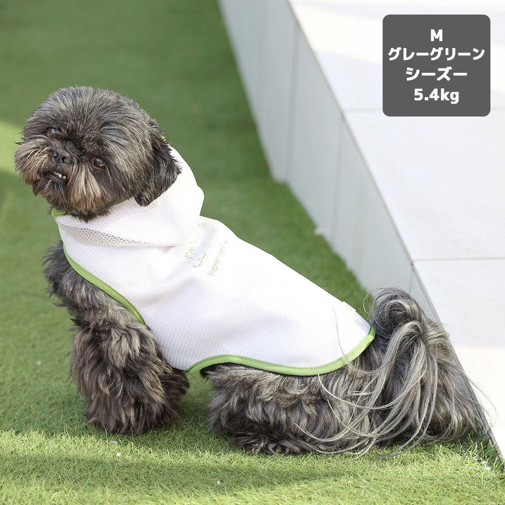 シーズー5.4kg(首26/胴38/丈38cm)のつぶくんはグレーグリーンのMを着用