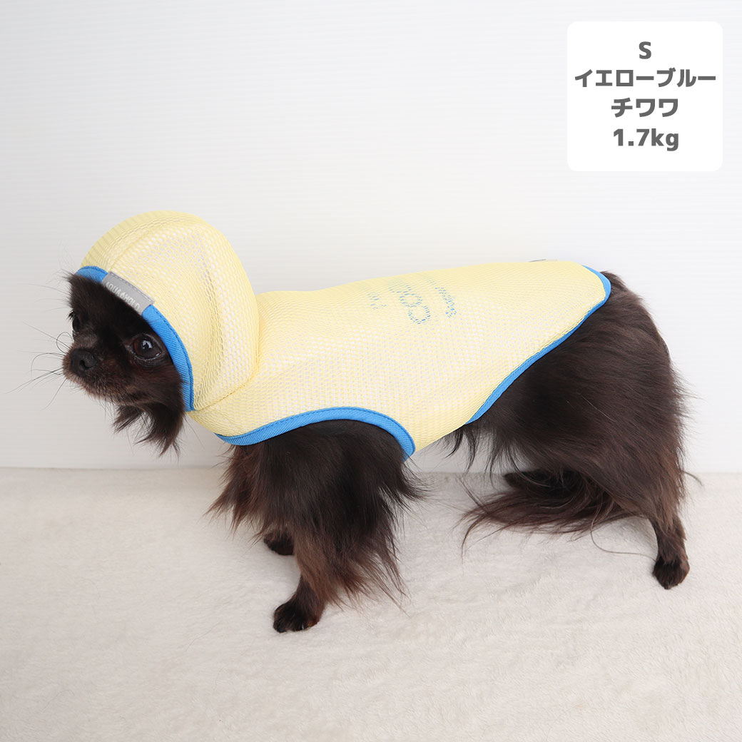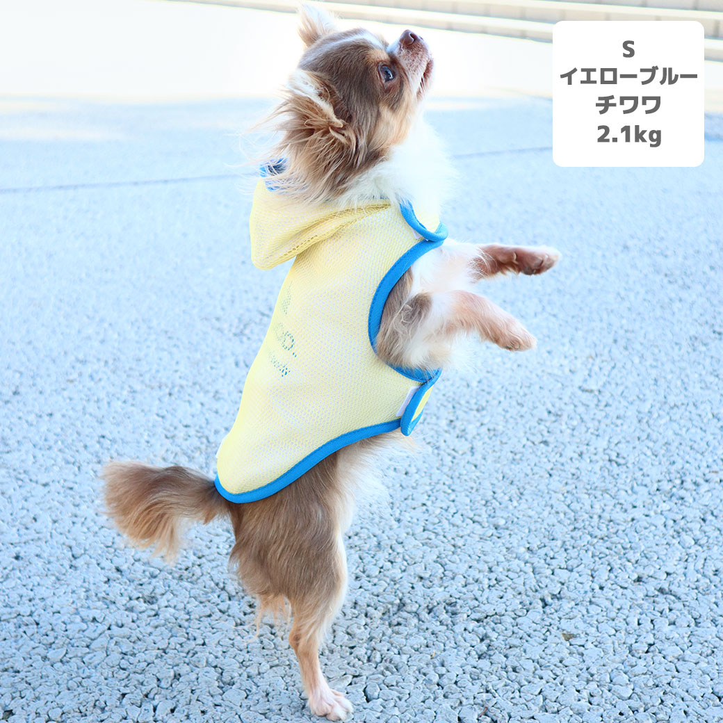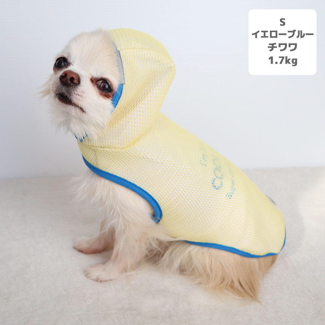 チワワ2.1kg(首19.5/胴30.5/丈22cm)の玉青ちゃんはイエローブルーのSを着用