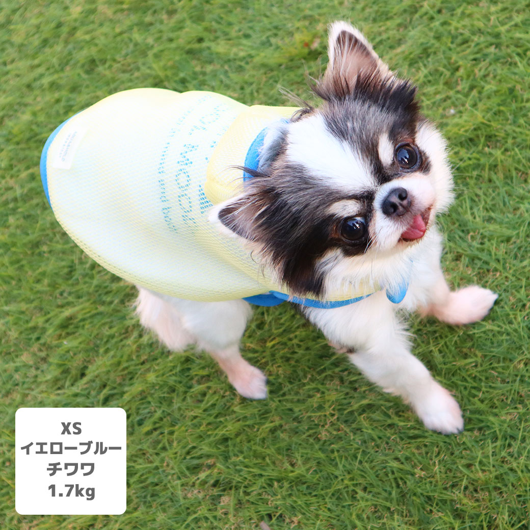 チワワ1.7kg(首18/胴27.5/丈18cm)の小真知ちゃんはイエローブルーのXSを着用