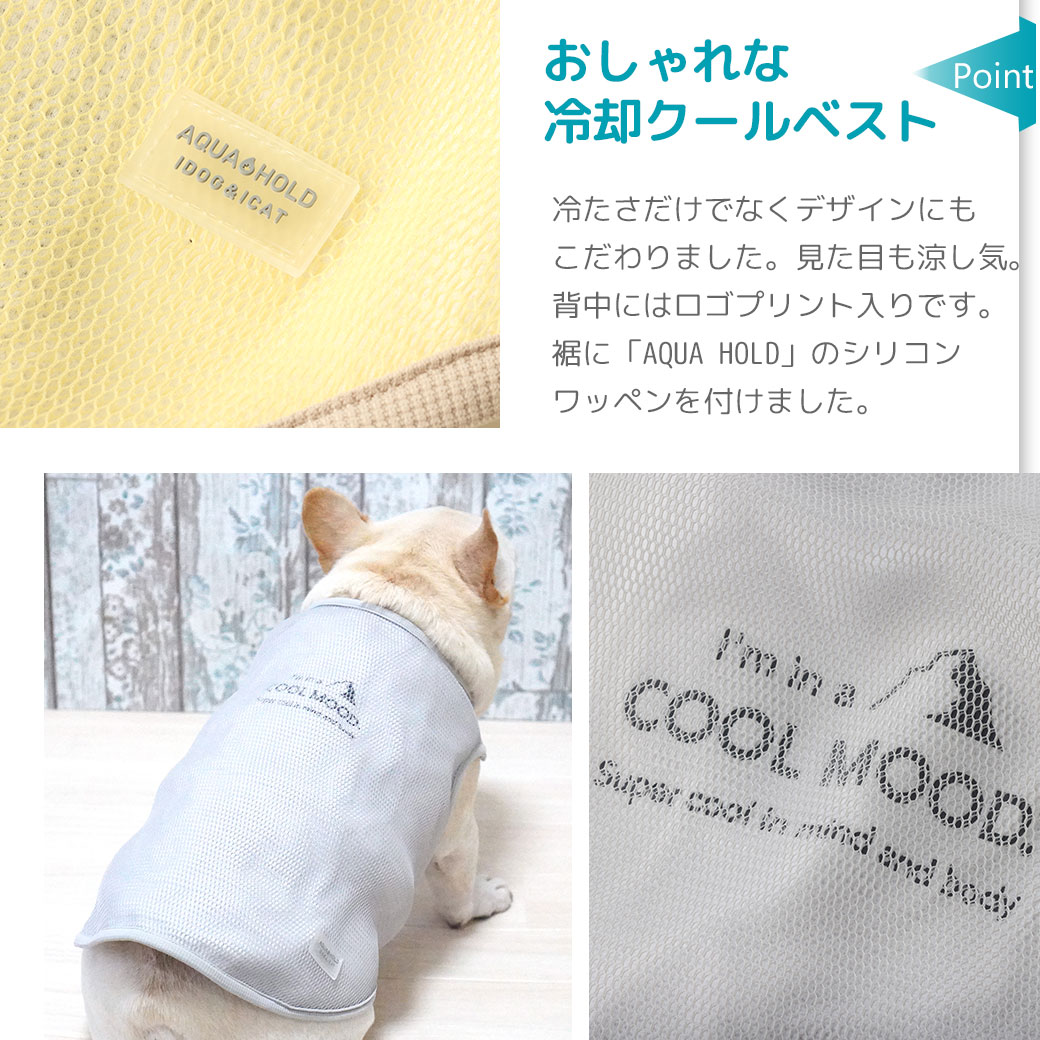 暑い日の外遊びにピッタリの犬用冷却クールタンクです。 保水生地と空冷機能でひんやり心地よく冷却し続けます。お出かけ前に水を含ませてご利用下さい。 肩開き仕様の新デザインで着せやすく、保水範囲も広がってさらに快適に!お腹側はストレッチする素材でフィット性が向上してさらにひんやり。 特許取得構造を利用したひんやり「冷却」タンク「AQUA HOLD PREMIUM」で新感覚のひんやり感を実感してください 。