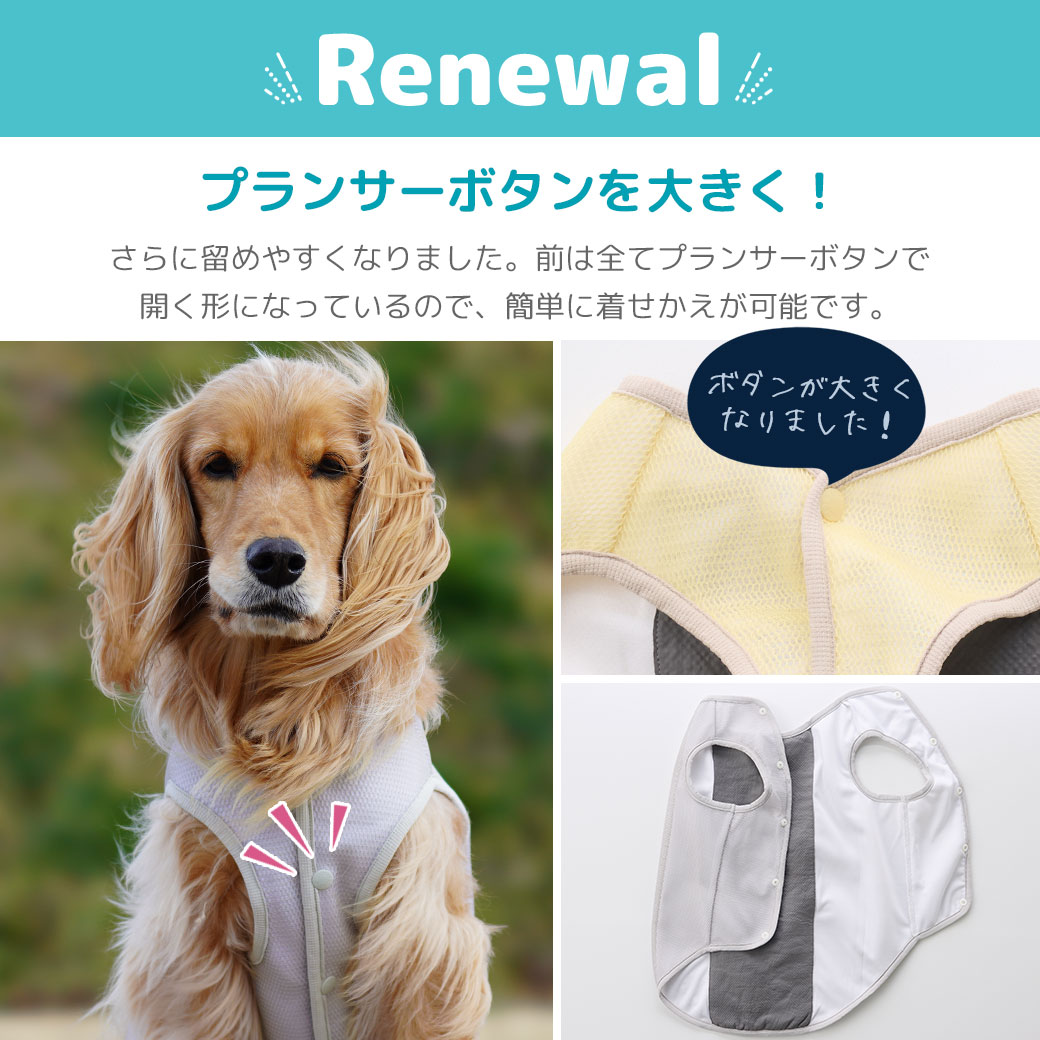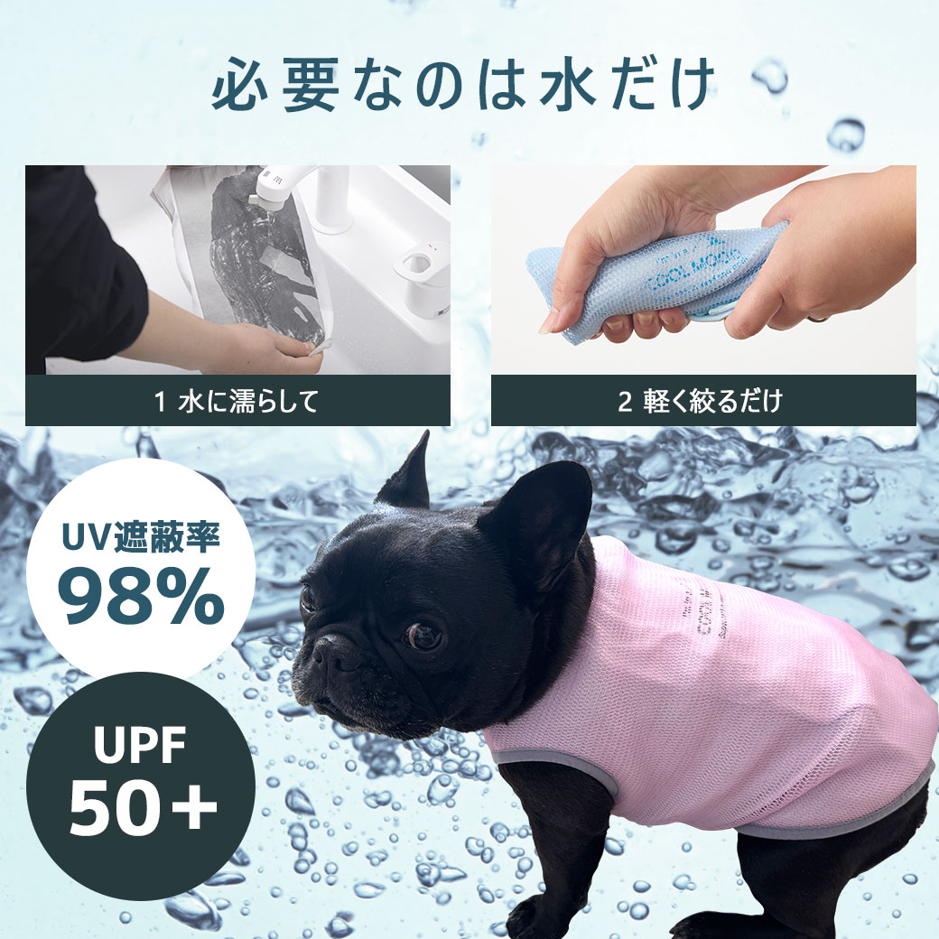 タンクトップの背中部分が濡らすととてもひんやりして気持ちよさそうです。また時間がたってもひんやりが続くので夏のお散歩で大活躍です。 メッシュになっていて通気性も良く、背中のプリントもかわいいです!