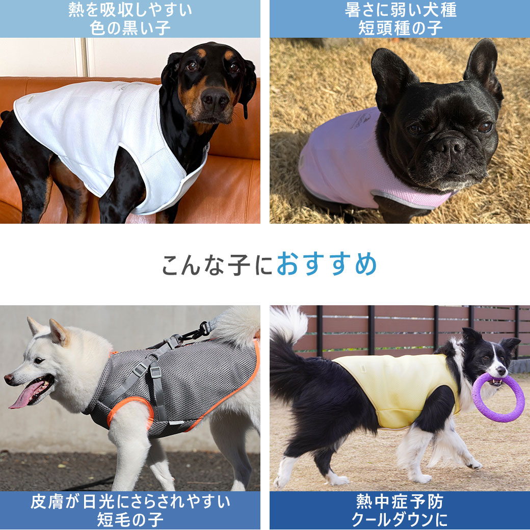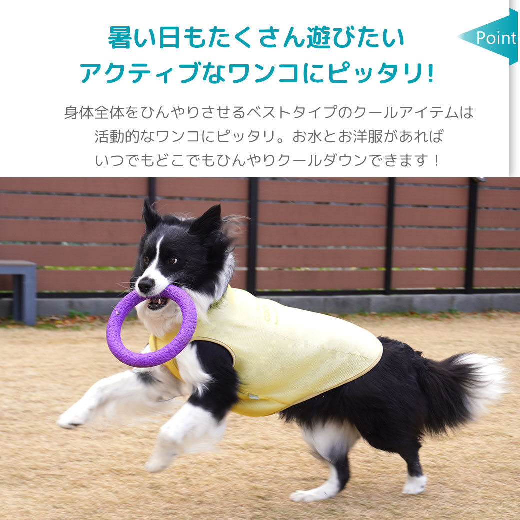 身体全体をひんやりさせるベストタイプのクールアイテムは活動的なワンコにピッタリ。