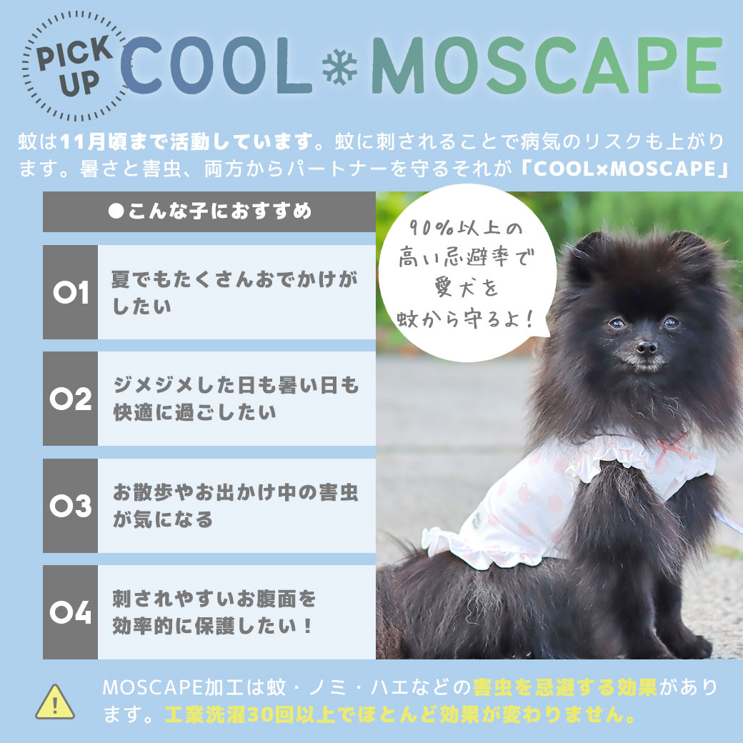 ひんやり気持ちいい接触冷感と防蚊・防虫Wの機能が愛犬を守ります。