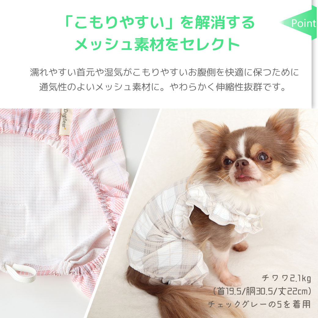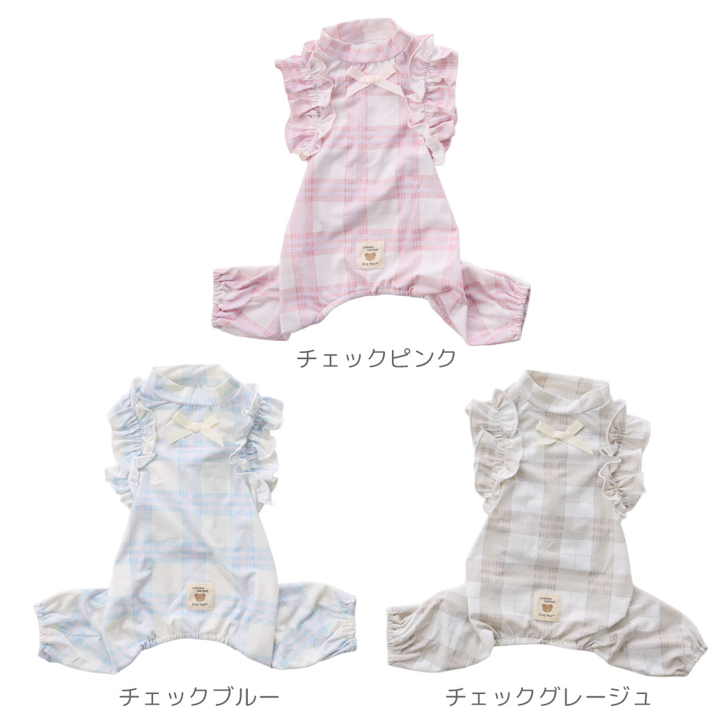 iDogfleurCOOL+MOSCAPEチェックフリルつなぎ接触冷感防蚊