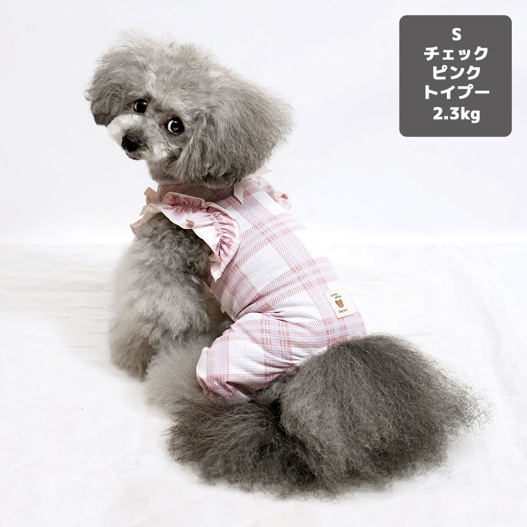 トイプー2.3kg(首18/胴31/丈24cm)のメルシーちゃんはチェックピンクのSを着用