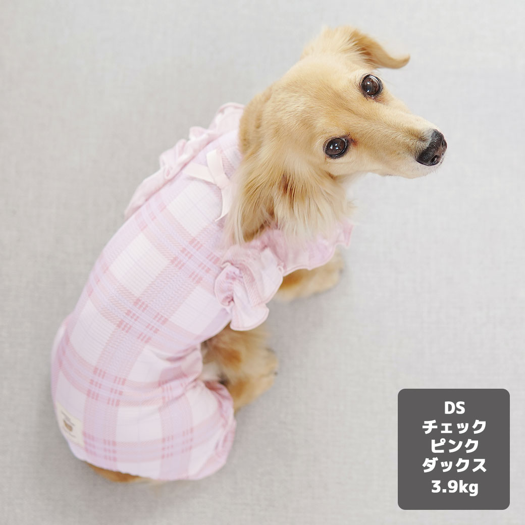 ミニチュアダックス3.9kg(首25/胴37/丈31cm)のクムちゃんはチェックピンクのDSを着用