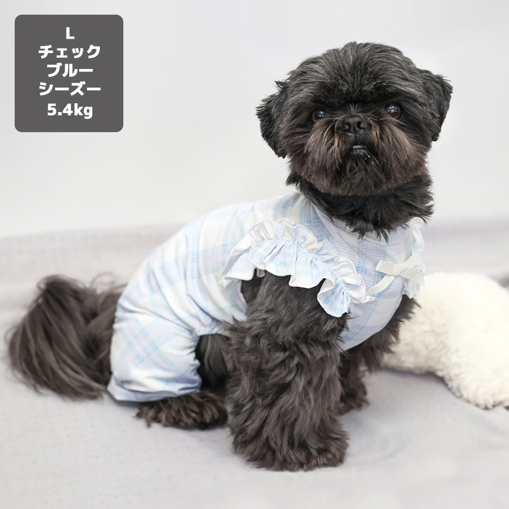 シーズー5.4kg(首26/胴38/丈38cm)のつぶくんはチェックブルーのLを着用