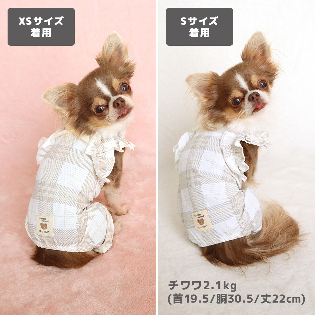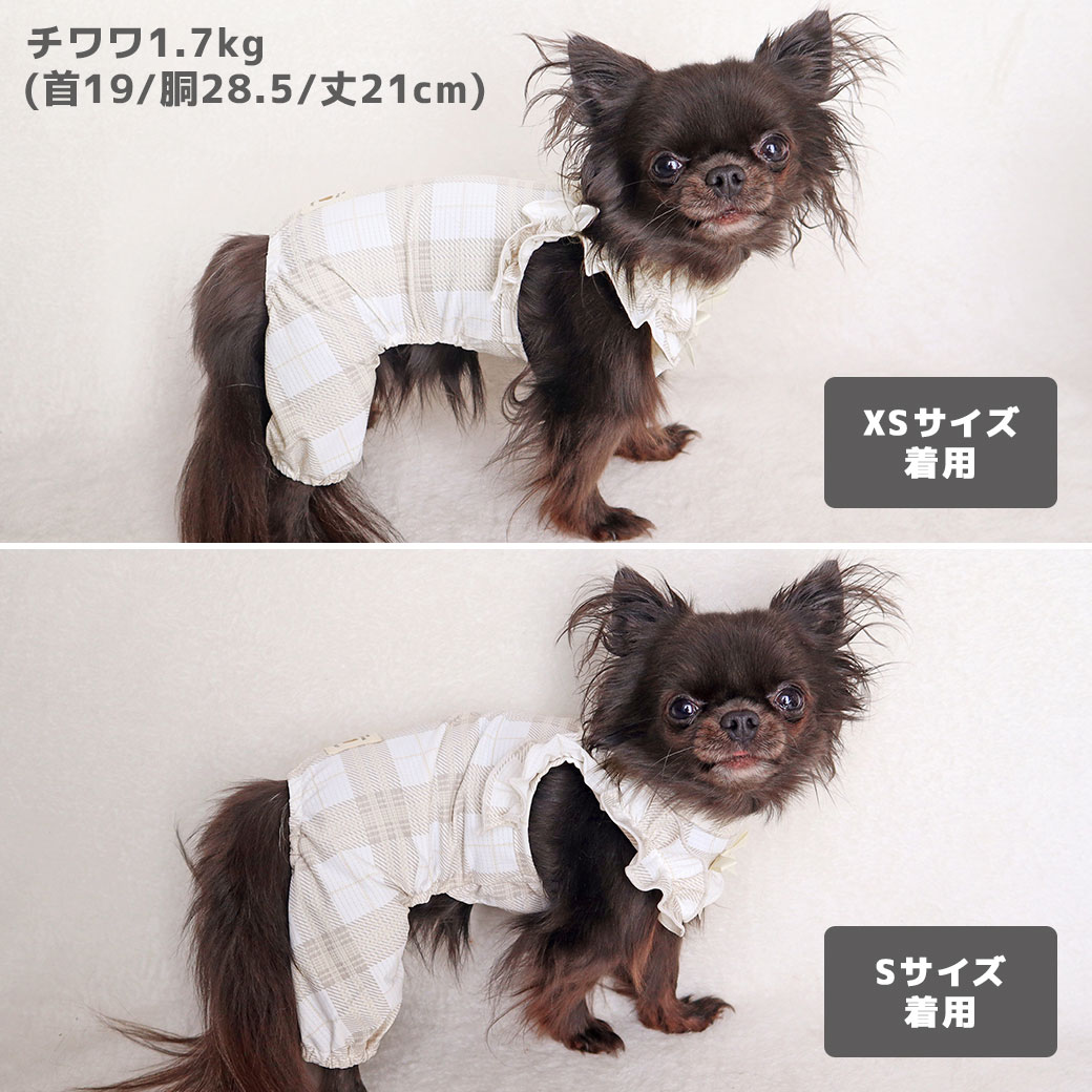 チワワ1.7kg(首19/胴28.5/丈21cm)の小桃ちゃんはチェックグレーのXSとSを着用