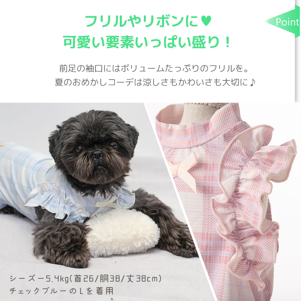 【 犬 ロンパース 】iDog fleur COOL+MOSCAPE チェックフリルつなぎ 接触冷感 防蚊 アイドッグ メール便OK