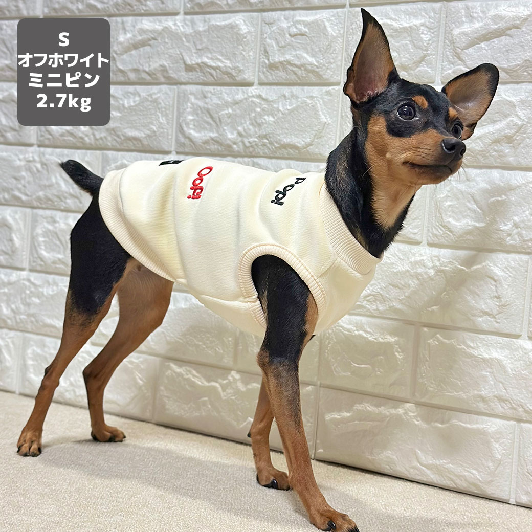 ミニピン2.7kg(首20/胴36/丈23.5cm)のルナちゃんはオフホワイトのSを着用