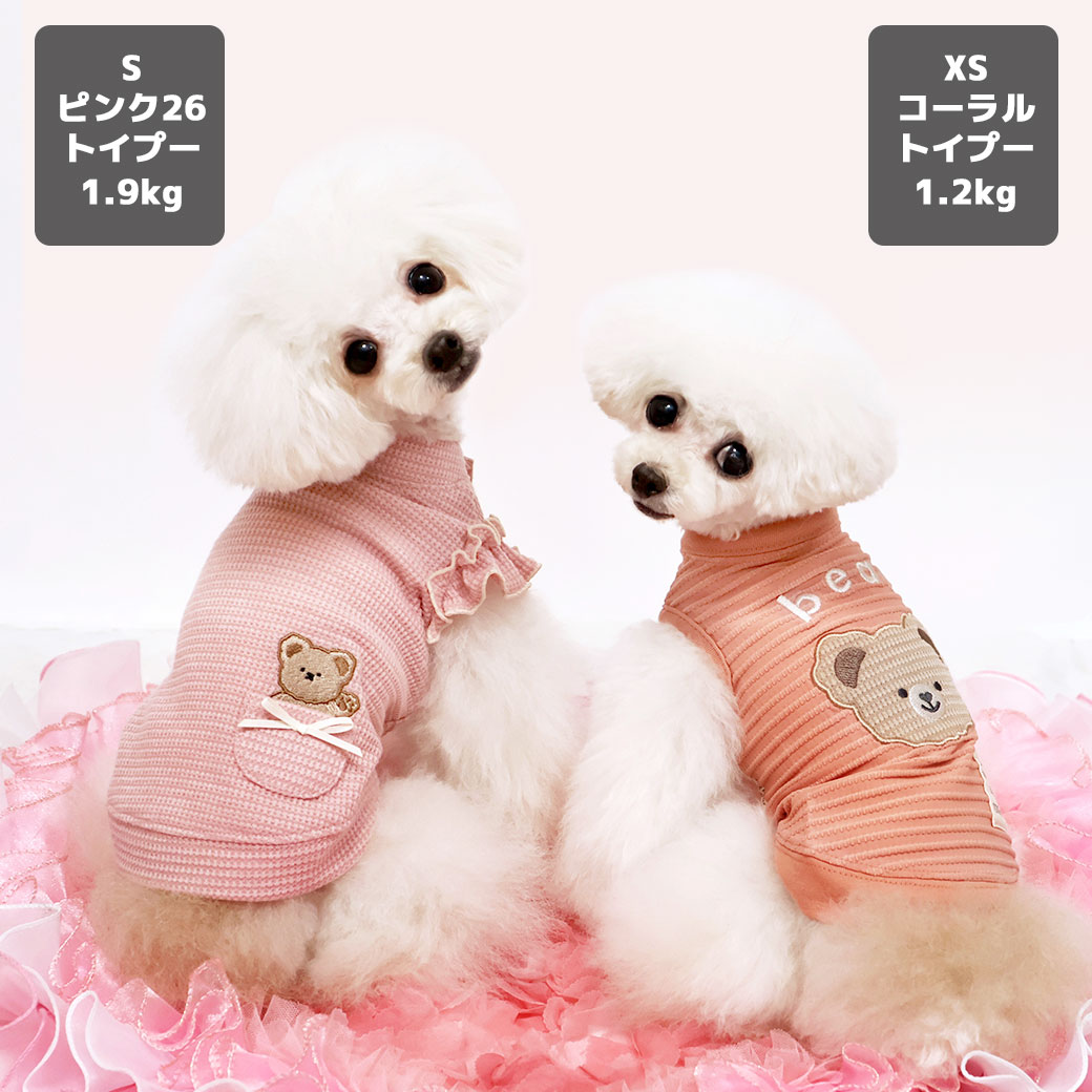 トイプー1.2kg(首15/胴26/丈19cm)のマユリちゃん(右)はコーラルのXSを着用、トイプー1.9kg(首17/胴29/丈22cm)のメリナちゃん(左)はピンク26のSを着用