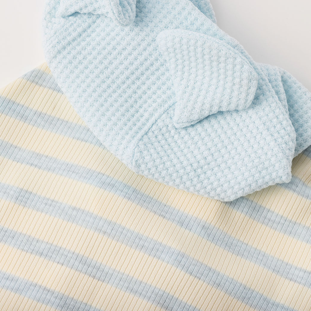 身頃はボーダー柄の薄手のリブ素材、軽くてよく伸びるので、春夏でもさらっと着られます。