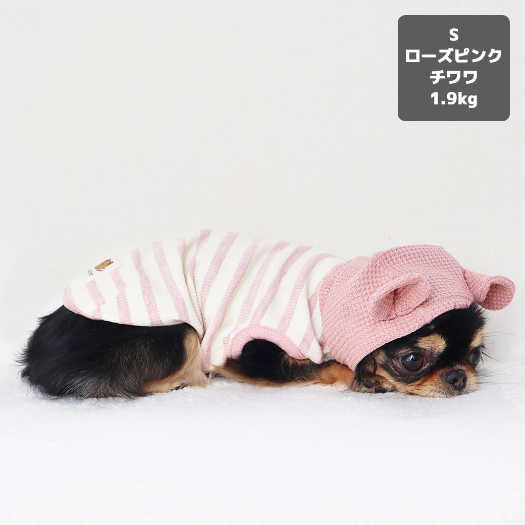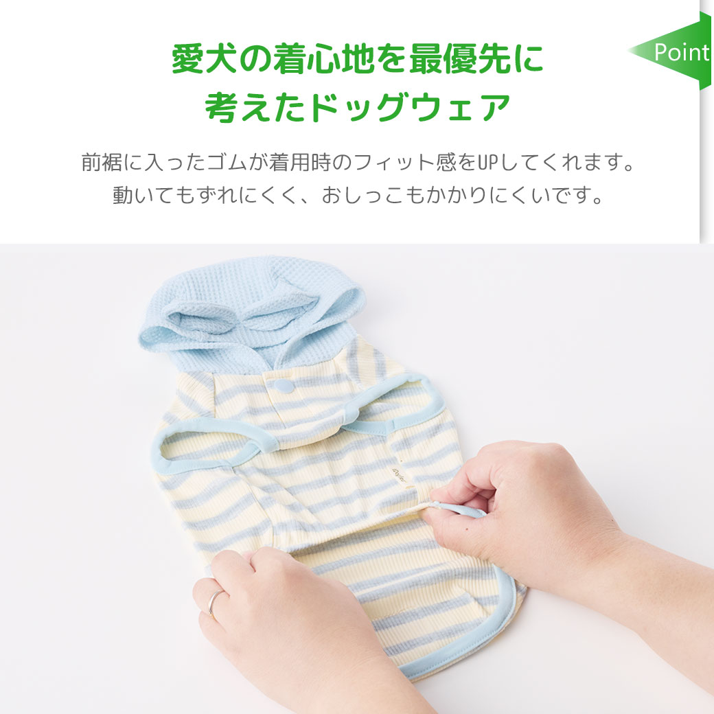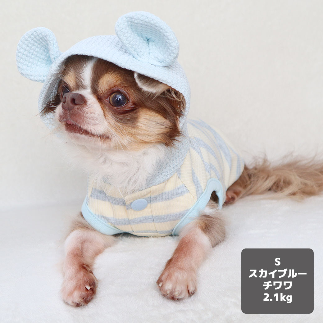薄手のリブ素材のボーダー柄にくま耳がついた犬用パーカーです。 キュート×カジュアルなデザインは男の子も女の子も似合います。 防蚊・防虫加工なので、虫が多い季節にもピッタリのドッグウェアです。