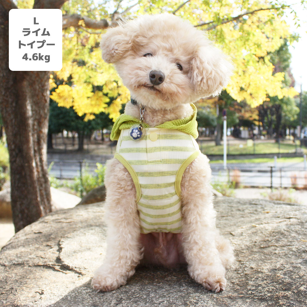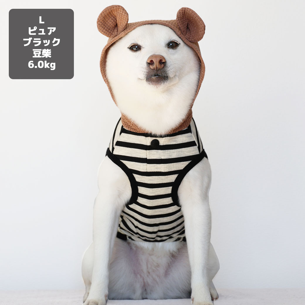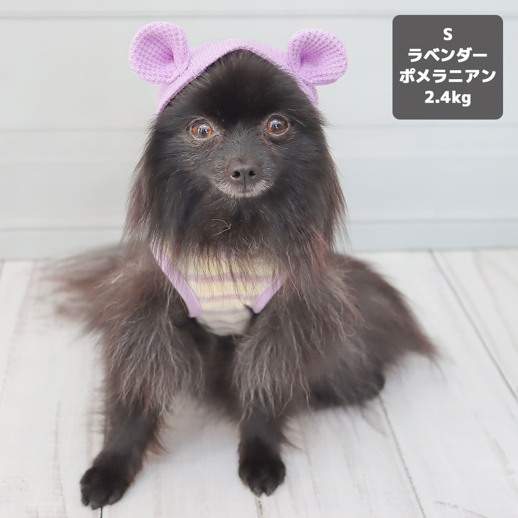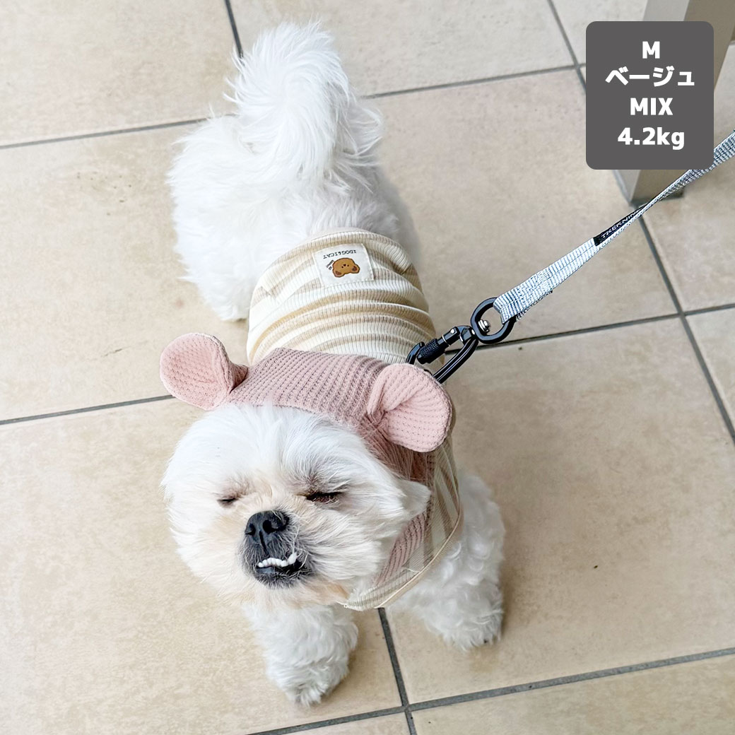 薄手のリブ素材のボーダー柄にくま耳がついた犬用パーカーです。 キュート×カジュアルなデザインは男の子も女の子も似合います。 防蚊・防虫加工なので、虫が多い季節にもピッタリのドッグウェアです。