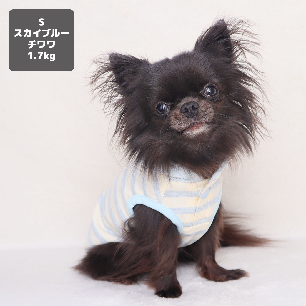 チワワ1.7kg(首19/胴28.5/丈21cm)の小桃ちゃんはスカイブルーのSを着用