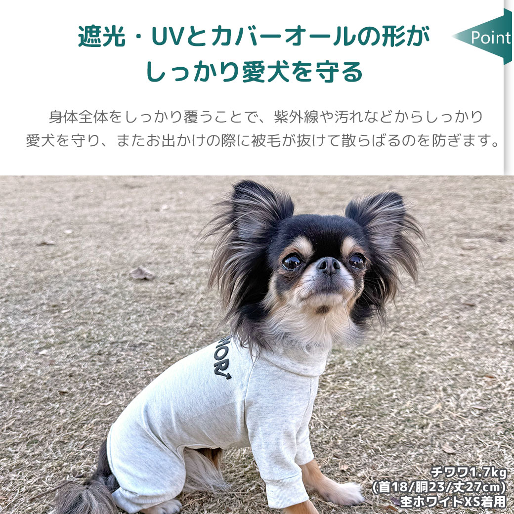 身体全体をしっかり覆うことで、紫外線や汚れなどからしっかり愛犬を守り、またお出かけの際に被毛が抜けて散らばるのを防ぎます。愛犬との共生に役立つ一枚です。