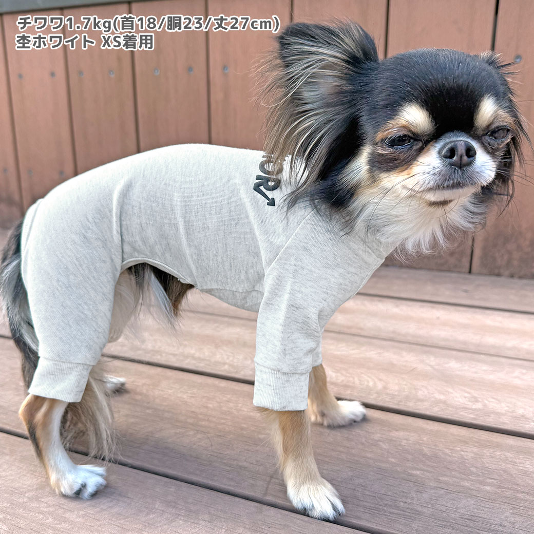 チワワ1.7kg(首18/胴23/丈27cm)のざらめちゃんは杢ホワイトのXSを着用