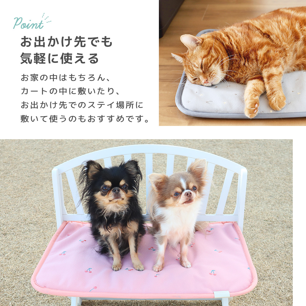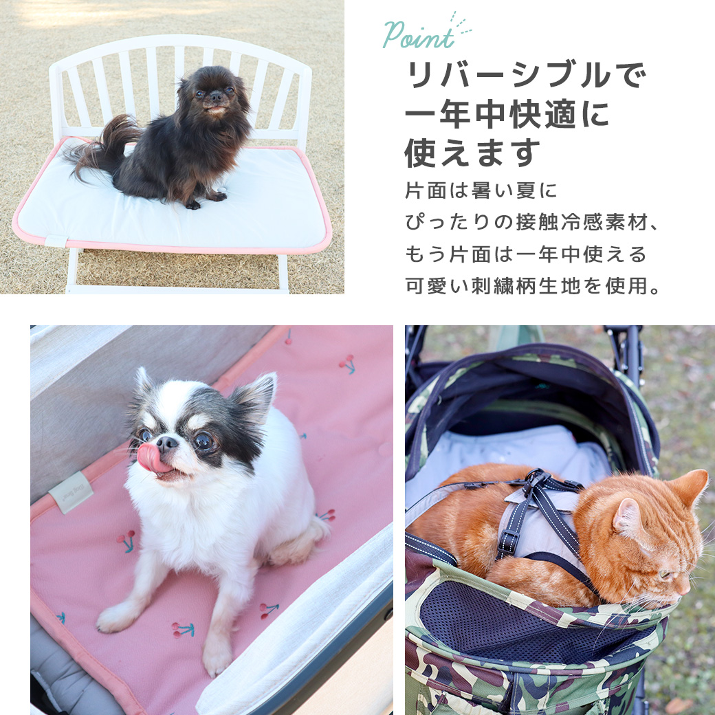 接触冷感素材のひんやり感で暑い日も涼しくスヤスヤ快眠。 可愛い刺繍生地とウレタンシートを使ったリバーシブルステイマット。