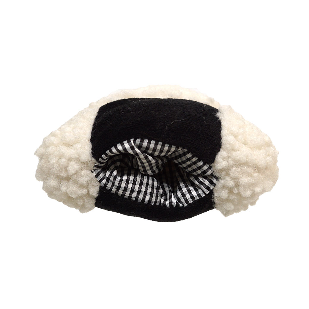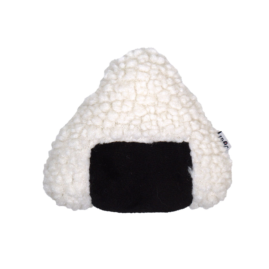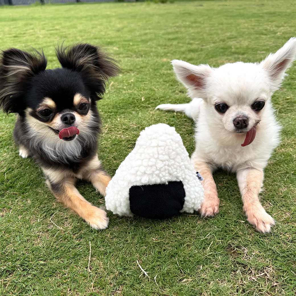 まるで本物みたいな、おにぎり型の犬用おもちゃ。ごはん部分にはふわふわのプードルボアを使用し、リアルな“ご飯粒感”を表現しました。