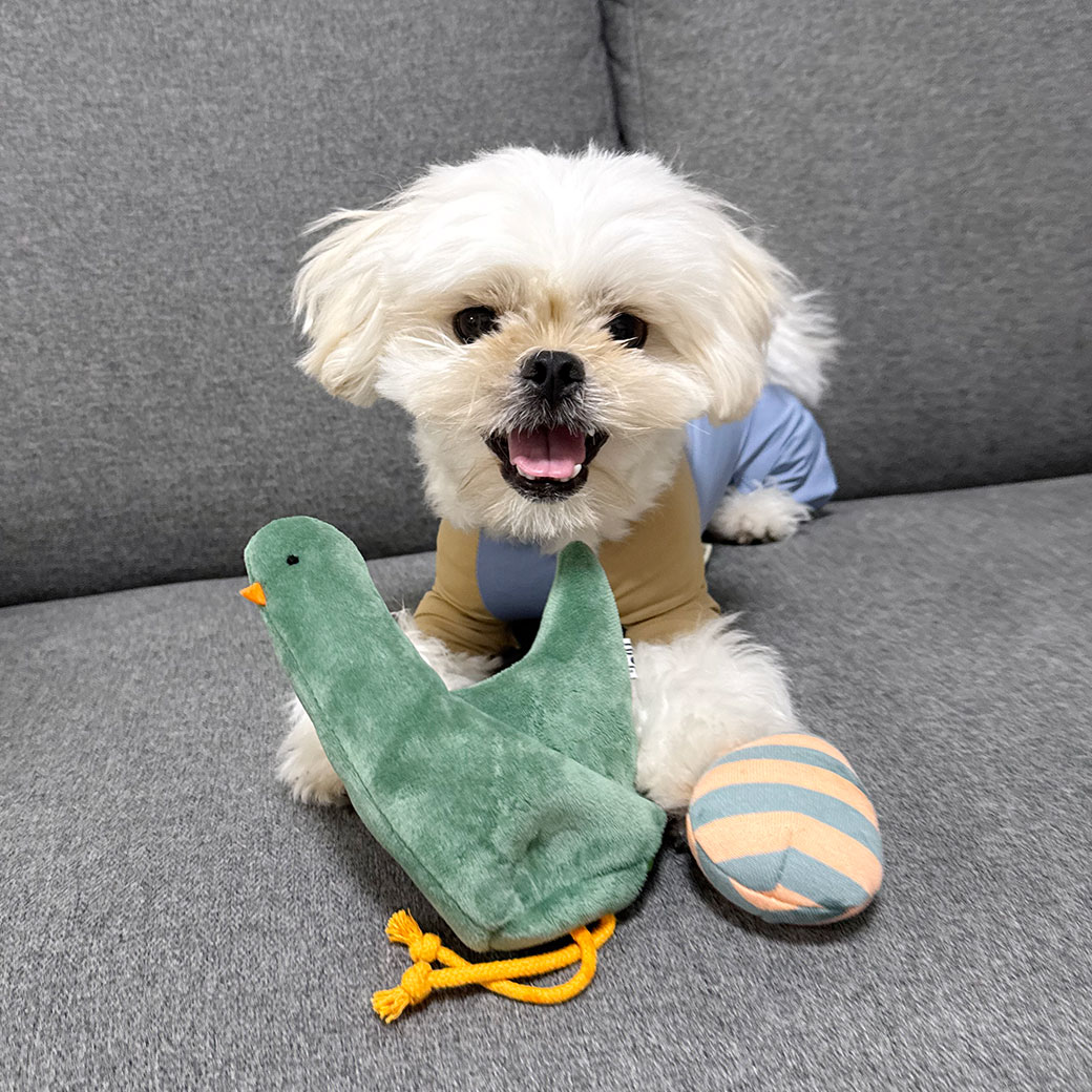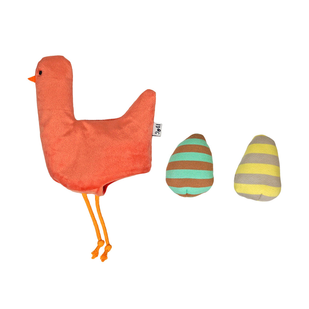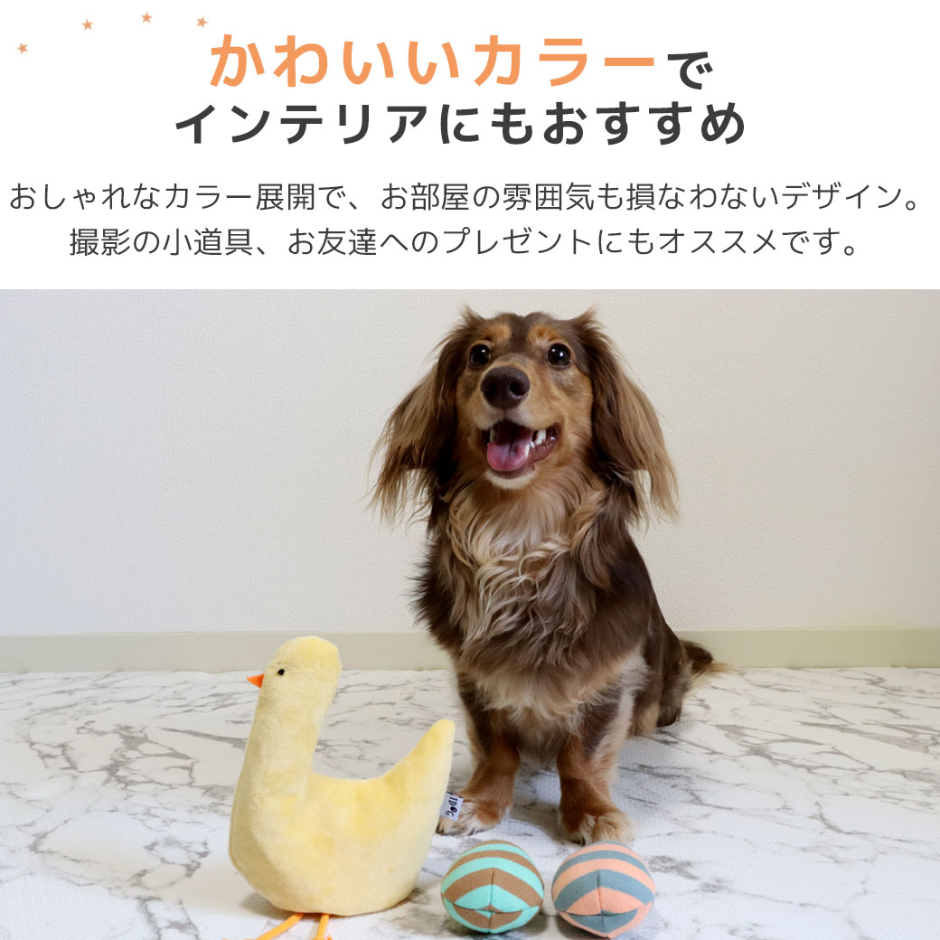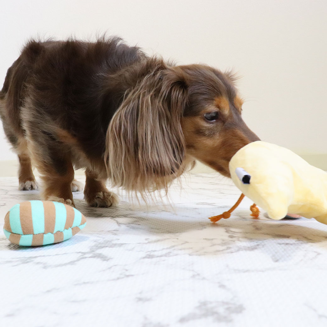 ポケットに何が入ってる?たまご?おやつ?それとも…!? ガチョウのおしりにひみつのポケット。カラフルなたまごは鳴き笛入りでピーピー鳴るよ! 音・形・しかけが全部そろった、遊び心満点のおもちゃ。 わんちゃんの「探す本能」をくすぐって、遊びがどんどん広がります!