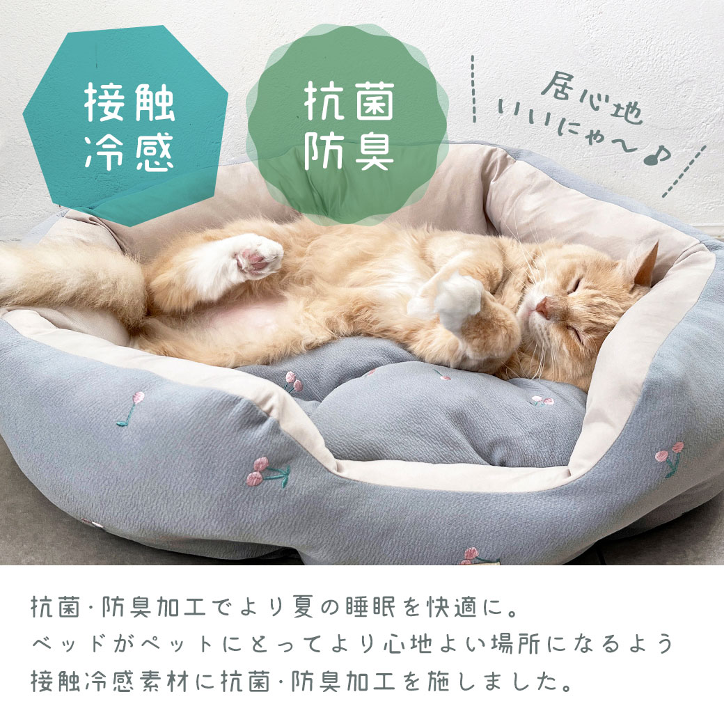 触れるとひんやりする接触冷感素材は、優しい触り心地で冷えすぎる心配もなく、ペットが快適に睡眠をとることができます。