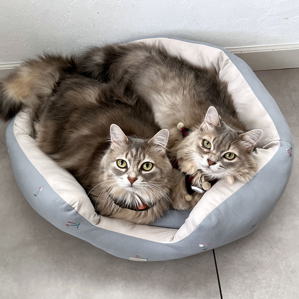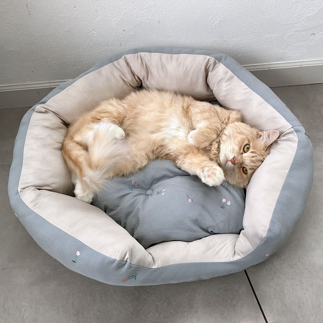 壁面にすっぽり包まれるラウンド型ペットベッド。
