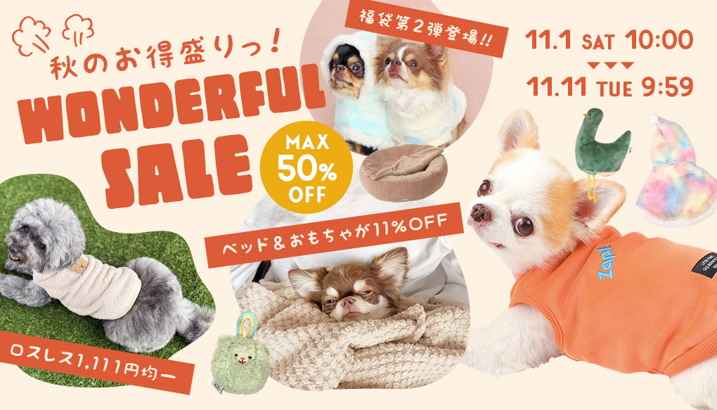 秋のお得が満載!! MAX50%OFFのワンダフルSALEや、新作福袋第2弾の販売開始 ロスレスウェア1,111円均一SALEや、新作ウェア&おもちゃ&ベッドの11%OFFSALEなどなど! この秋おすすめアイテムを中心にどどーーんと お得なSALEやイベントが盛りだくさん♪ ▼▼対象商品やイベントをチェックしに行きましょう▼▼